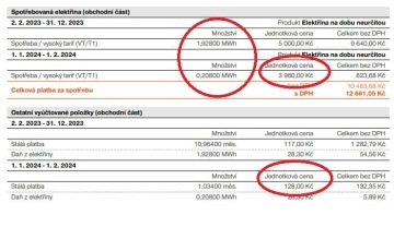 Elektřinu mají dnes za 3960 Kč/MWh a měsíční platbu 128 Kč. Za plyn platí 1790 Kč/MWh a měsíční platbu 128 Kč.