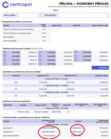 A nyní se podíváme na úsporu v elektřině. Pan Jan nyní odebírá elektřinu též od Centropolu, kde platí 3449 Kč ve vysokém tarifu a 3069 v nízkém. Měsíční plat v obchodní složce ceny je pak 77 Kč.