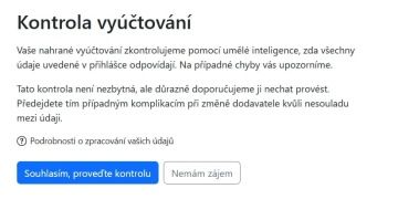 V procesu přihlášky nově proto najdete AI nástroj, který vaše nahrané vyúčtování zdarma zkontroluje, porovná informace ve formuláři a upozorní vás na případné nesrovnalosti. Pokud to bude možné, nástroj vám hned nabídne opravu údajů.